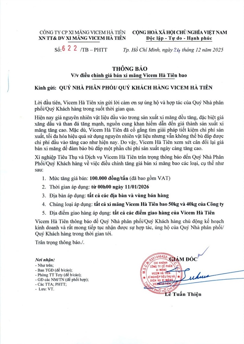 Đối với VICEM Hà Tiên, doanh nghiệp này cũng đã triển khai kế hoạch điều chỉnh giá bán xi măng bao trên phạm vi cả nước. Theo đó, mức tăng 100.000 đồng/tấn (đã bao gồm VAT) sẽ được áp dụng từ 00 giờ ngày 11/01/2026 cho tất cả các chủng loại xi măng bao 50kg và 40kg.