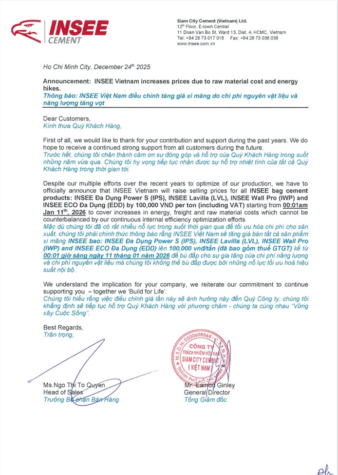 INSEE Việt Nam cũng nằm trong nhóm doanh nghiệp điều chỉnh giá bán xi măng bao trong tháng 01/2026. Theo kế hoạch, doanh nghiệp sẽ áp dụng mức tăng 100.000 đồng/tấn (đã bao gồm thuế GTGT) đối với các dòng sản phẩm INSEE Đa Dụng Power S, INSEE Lavilla, INSEE Wall Pro và INSEE ECO Đa Dụng, bắt đầu từ 11/01/2026.