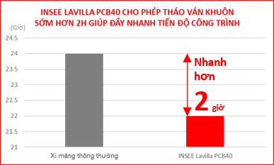 Xi măng INSEE Lavilla PCB40 tạo ra bê tông có cường độ sớm cao cho phép tháo ván khuôn sớm hơn 2 giờ so với xi măng thông thường, tái sử dụng ván khuôn nhanh, rút ngắn thời gian chờ giữa khác hạng mục như đổ cột, xây tường bao, đẩy nhanh tiến độ và sớm bàn giao công trình.