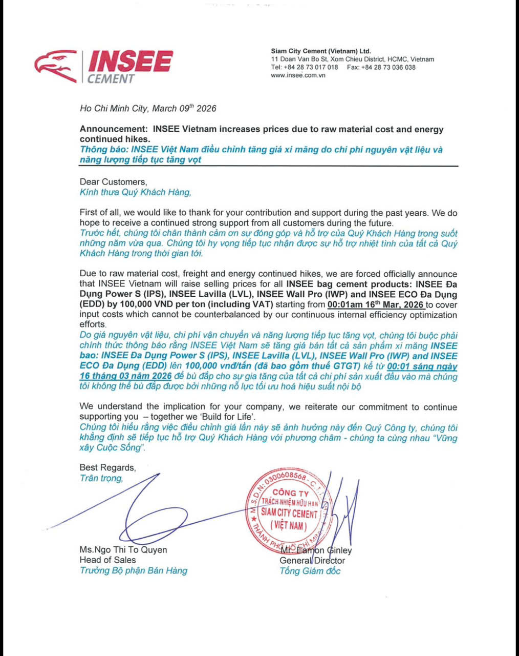 Theo thông báo từ Công ty TNHH Siam City Cement (Việt Nam), mức điều chỉnh tăng 100.000 đồng/tấn (đã bao gồm VAT) sẽ được áp dụng đối với các sản phẩm xi măng bao mang thương hiệu INSEE. Chính sách giá mới bắt đầu có hiệu lực từ 00h01 ngày 16/03/2026.