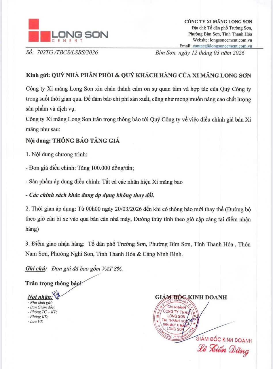 Theo nội dung thông báo, mức giá xi măng bao được điều chỉnh tăng thêm 100.000 đồng/tấn (đã bao gồm VAT 8%), áp dụng cho toàn bộ các nhãn hiệu xi măng bao của doanh nghiệp. Các chính sách bán hàng và điều kiện thương mại khác vẫn được giữ nguyên, không có thay đổi trong đợt điều chỉnh lần này.