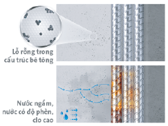 Bê tông thông thường có các lỗ rỗng mà mắt thường không nhìn thấy được. Xi Măng ECO Đa Dụng lấp kín những lỗ rỗng trong khối bê tông, hạn chế xâm nhập của các nhân tố ăn mòn như không khí, nước ngầm, nước nhiễm phèn mặn, giúp hạn chế hiện tượng cốt thép bị gỉ sét, nâng cao tính bền chắc của bê tông.