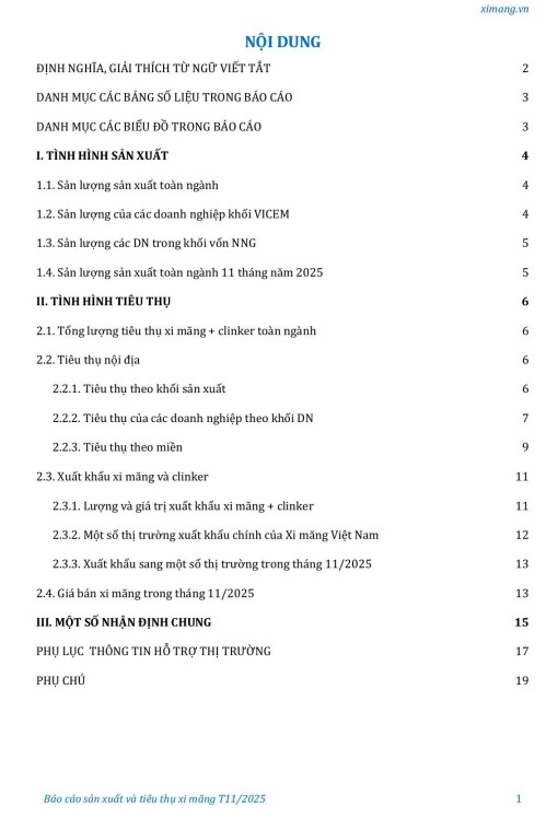 Báo cáo Tình hình Sản xuất và Tiêu thụ Xi măng Việt Nam tháng 11/2025 (Monthly Cement Report - MCR 11/2025) do Trung tâm Thông tin và Dữ liệu Xi măng (CIDC) tổng hợp và biên soạn, cung cấp cho độc giả chuyên ngành bức tranh toàn diện về diễn biến thị trường xi măng trong giai đoạn cuối năm. Báo cáo cập nhật đầy đủ các số liệu về sản lượng sản xuất xi măng và clinker trong tháng 11 cũng như lũy kế 11 tháng năm 2025; tình hình tiêu thụ nội địa theo khối doanh nghiệp và theo từng vùng miền; hoạt động xuất khẩu xi măng, clinker cùng cơ cấu các thị trường xuất khẩu chủ lực.