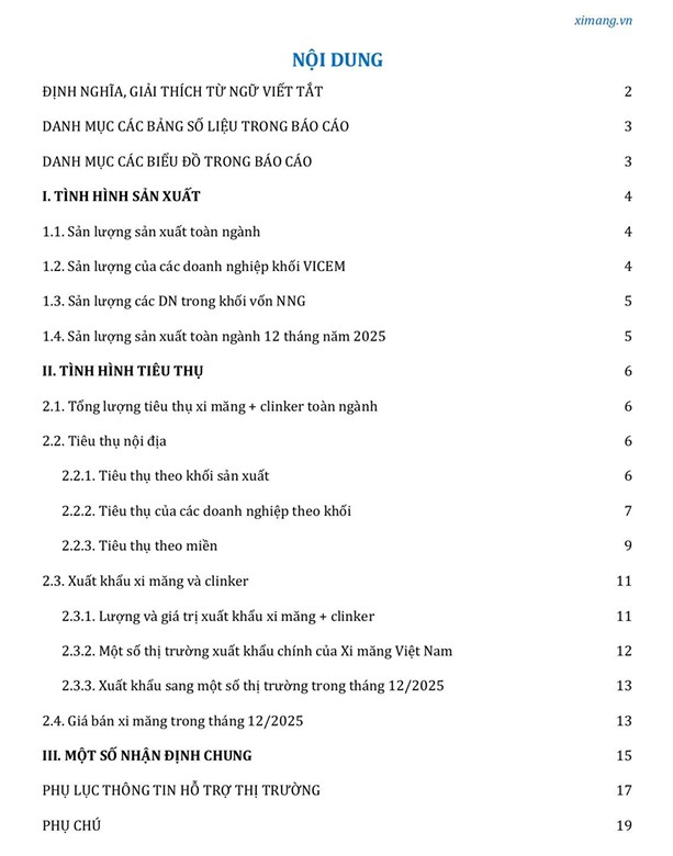 Báo cáo Tình hình Sản xuất và Tiêu thụ Xi măng Việt Nam tháng 12/2025 (Monthly Cement Report - MCR 12/2025) do Trung tâm Thông tin và Dữ liệu Xi măng (CIDC) tổng hợp và biên soạn, cung cấp cho độc giả chuyên ngành bức tranh đầy đủ và cập nhật về diễn biến thị trường xi măng trong tháng cuối cùng của năm 2025.