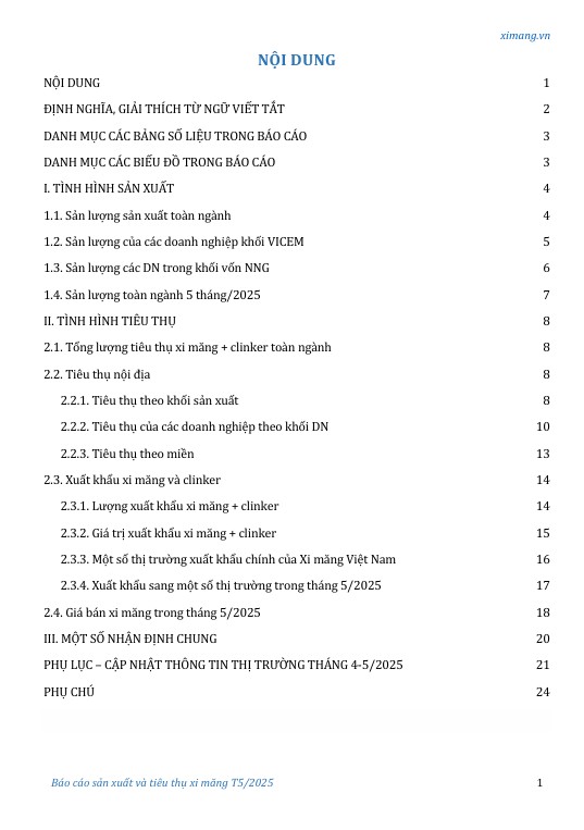 Báo cáo tổng hợp kết quả sản xuất - tiêu thụ tháng 5/2025, kèm nhận định về tình hình thị trường, xuất khẩu và các yếu tố chính sách - kinh tế ảnh hưởng đến hoạt động ngành xi măng trong giai đoạn quý II. Phụ lục dữ liệu hỗ trợ thị trường tháng 5 - 6/2025 cập nhật nhóm công trình xây dựng, hình thức thi công và đặc điểm tiêu thụ theo khu vực.