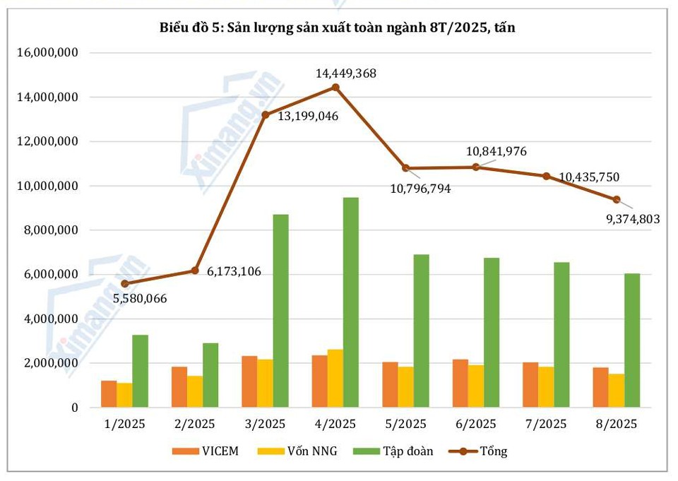 Tổng sản lượng sản xuất toàn ngành tháng 8/2025 đạt khoảng 10,43 triệu tấn, gần tương đương tháng 7. Các dây chuyền thuộc khối VICEM và Tập đoàn - Địa phương tiếp tục duy trì công suất cao, trong khi một số doanh nghiệp nhỏ hơn lựa chọn sản xuất linh hoạt theo nhu cầu thị trường.