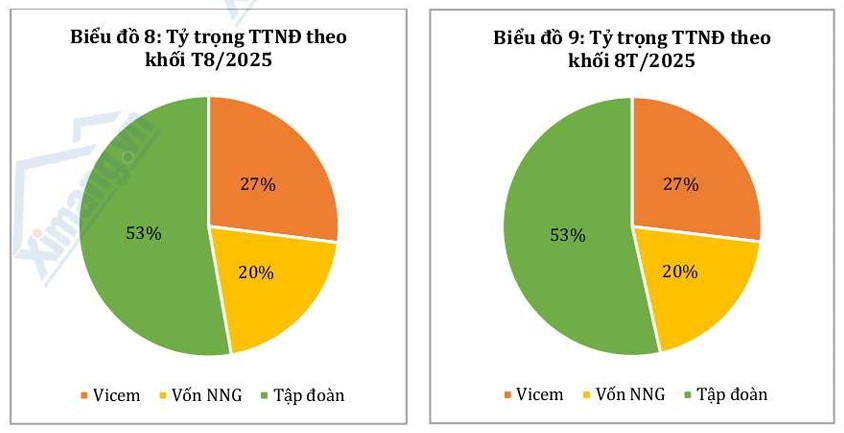 » Thị trường xi măng tháng 8/2025 duy trì trạng thái ổn định sau hai tháng phục hồi. Sản xuất và tiêu thụ nội địa giữ ở mức tương đương tháng 7, trong khi xuất khẩu tiếp tục tăng, giúp toàn ngành duy trì hoạt động hiệu quả. Bối cảnh thời tiết thuận lợi, nhu cầu vật liệu từ các dự án hạ tầng, công nghiệp và dân dụng vẫn được duy trì.