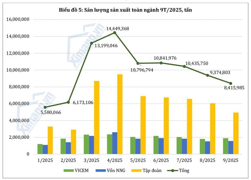 Tổng sản lượng sản xuất toàn ngành tháng 9/2025 đạt khoảng 9,37 triệu tấn, giảm gần 10% so với tháng 8. Một số nhà máy khu vực miền Trung và miền Bắc tạm thời giảm công suất do mưa bão kéo dài và nhu cầu nội địa chững lại. Tuy nhiên, khối VICEM và các doanh nghiệp có hợp đồng xuất khẩu lớn vẫn vận hành ổn định, giúp duy trì sản lượng toàn ngành.