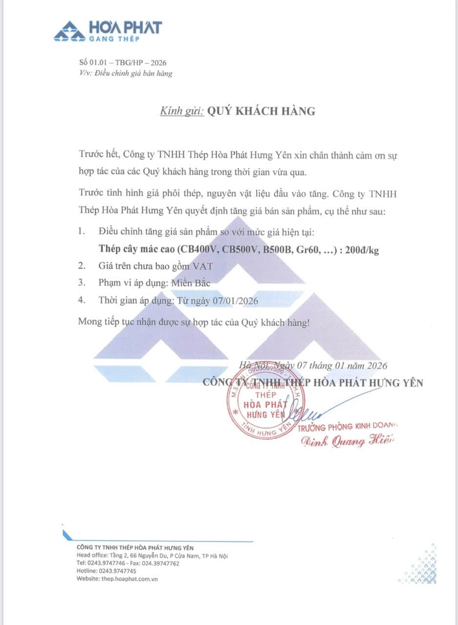 Đối với Thép Hòa Phát, giá bán thép cây và thép cuộn các loại điều chỉnh tăng 150 đồng/kg áp dụng từ ngày 26/12/2025. Giá thép cây mác cao CB400V, CB500V, B500B... được cập nhật tăng 200 đồng/kg kể từ ngày 07/01/2026, áp dụng tại thị trường miền Bắc. Đến ngày 12/01/2026 thép cuộn xây dựng, thép cây tăng 200 đồng/kg và thép cuộn rút dây tăng 100 đồng/kg, đơn giá chưa bao gồm thuế VAT.