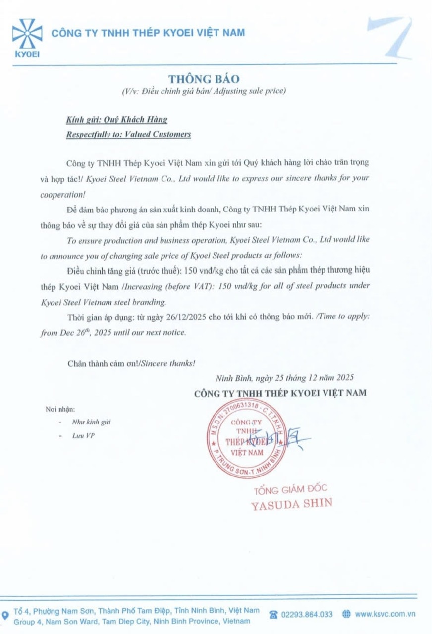Trong khi đó, Thép Kyoei Việt Nam đã cập nhật giá bán tất cả các sản phẩm thép xây dựng từ ngày 26/12/2025 với mức tăng 150 đồng/kg áp dụng cho tất cả các vùng thị trường.