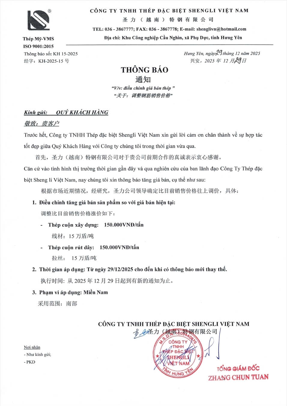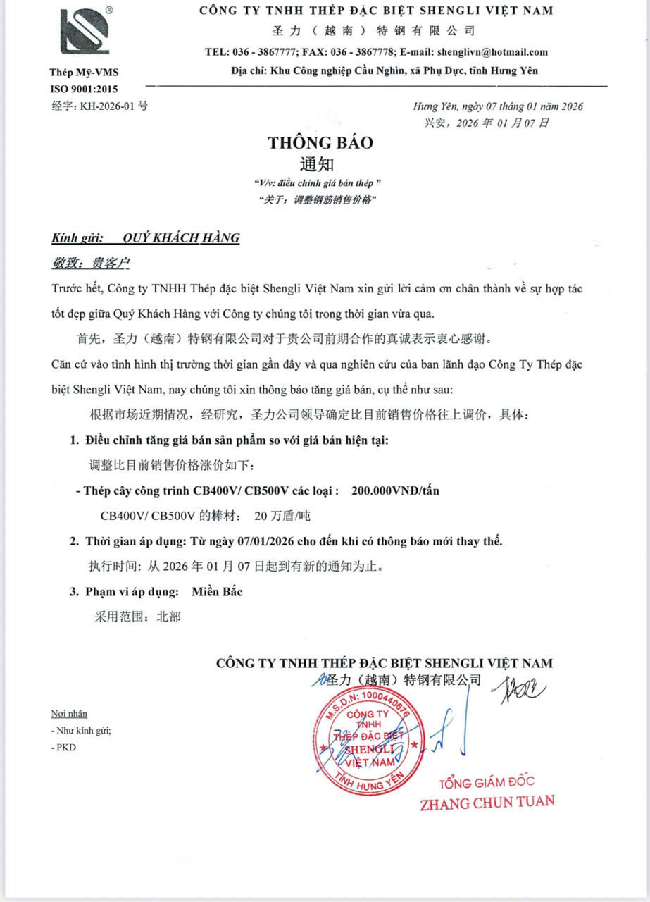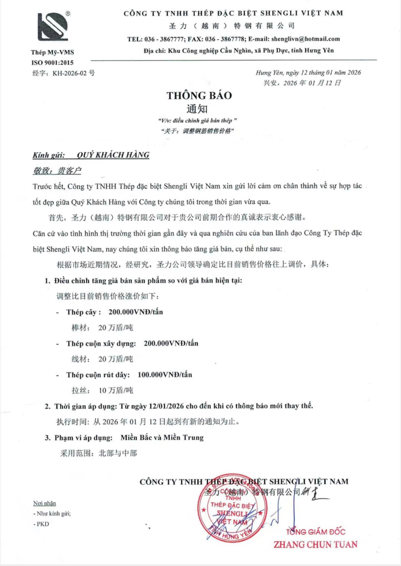 Với Thép Shengli Việt Nam, cuối tháng 12/2025 doanh nghiệp điều chỉnh tăng giá thép cuộn xây dựng và thép cuộn rút dây thêm 150.000 đồng/tấn. Sang ngày 07/01/2026, giá thép cây công trình CB400V và CB500V các loại được cập nhật tăng 200 đồng/kg tại thị trường miền Bắc. Đến ngày 12/01/2026, giá thép cây và thép cuộn xây dựng tăng 200 đồng/kg, thép cuộn rút dây tăng 100 đồng/kg áp dụng cho thị trường miền Bắc và miền Trung.