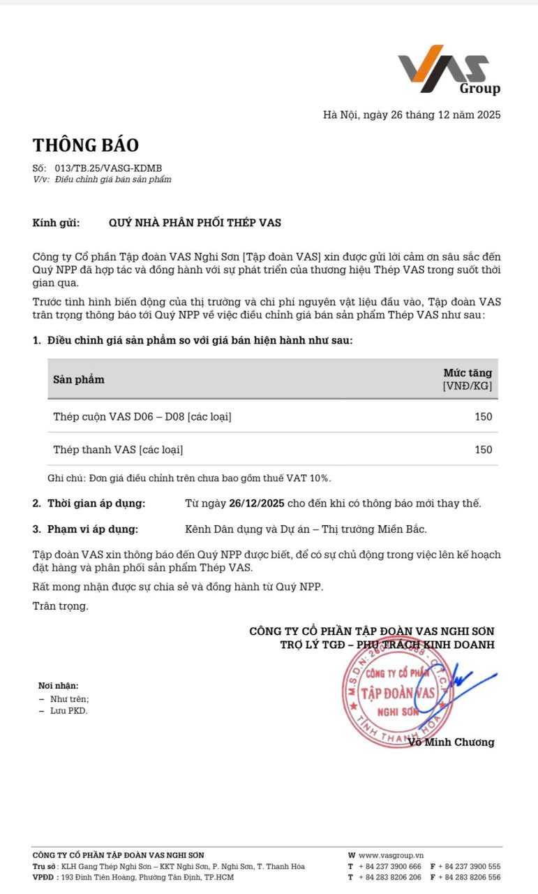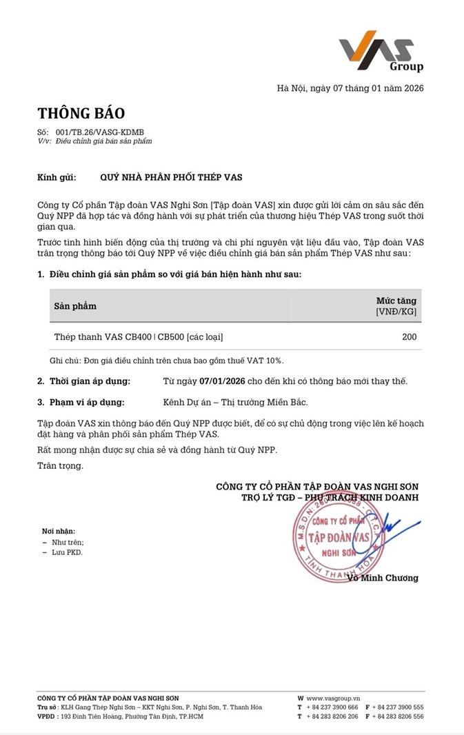Tập đoàn VAS ghi nhận hai mốc điều chỉnh khác nhau. Ngày 26/12/2025, giá thép cuộn D06 - D08 các loại và các loại thép thanh các loại được điều chỉnh tăng 150 đồng/kg. Đến ngày 07/01/2026, giá thép thanh CB400 và CB500 các loại tiếp tục được cập nhật tăng 200 đồng/kg, áp dụng cho kênh dự án tại thị trường miền Bắc, đơn giá chưa bao gồm VAT.