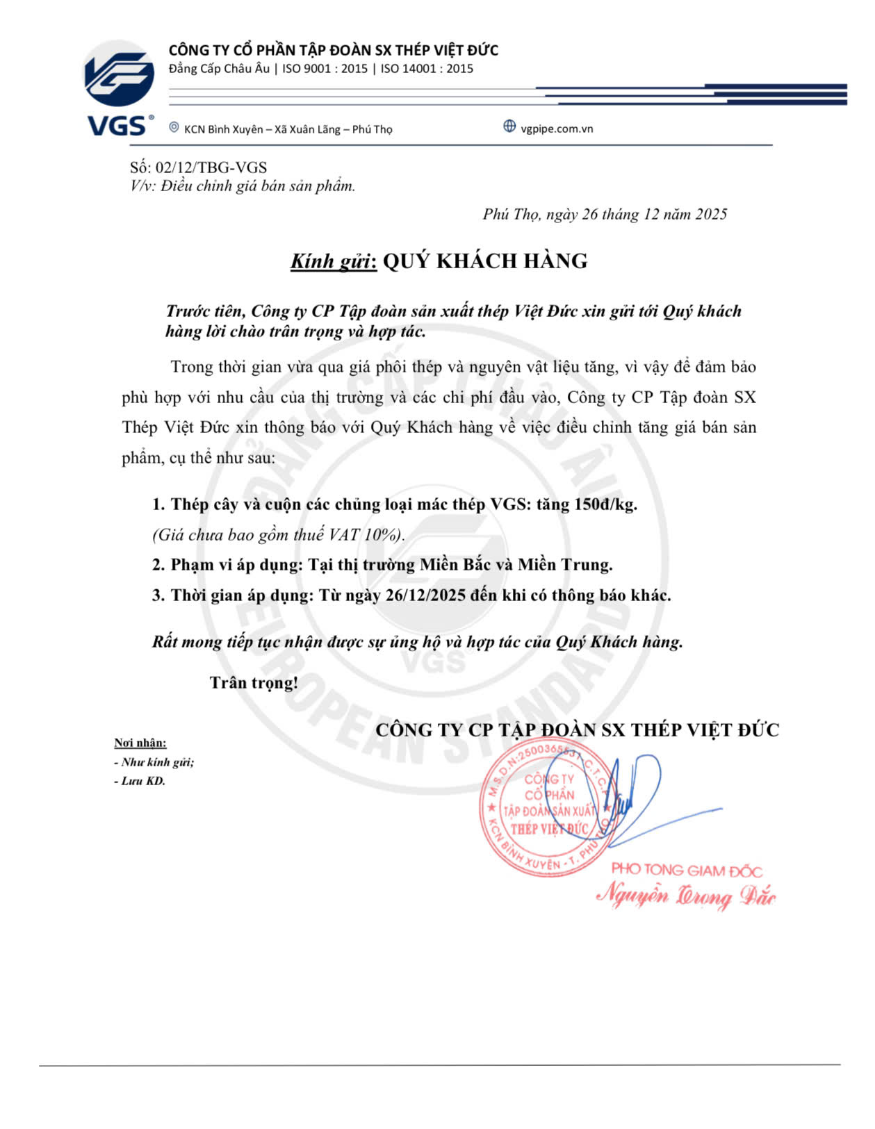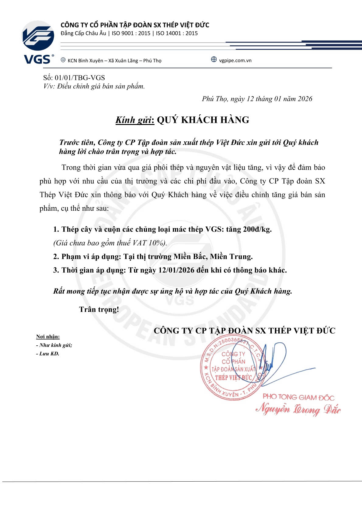 Thép Việt Đức cũng thực hiện điều chỉnh giá. Từ ngày 26/12/2025, giá thép cây và cuộn các chủng loại mác thép VGS tại thị trường miền Bắc và miền Trung tăng 150 đồng/kg. Đến ngày 07/01/2026, giá thép cây và thép cuộn thị trường miền Bắc được điều chỉnh tăng thêm 200 đồng/kg và ngày 12/01/2026 có thông báo giá thép cây và cuộn tăng 200 đồng/kg áp dụng cho cả thị trường miền Bắc và miền Trung, giá chưa bao gồm VAT.