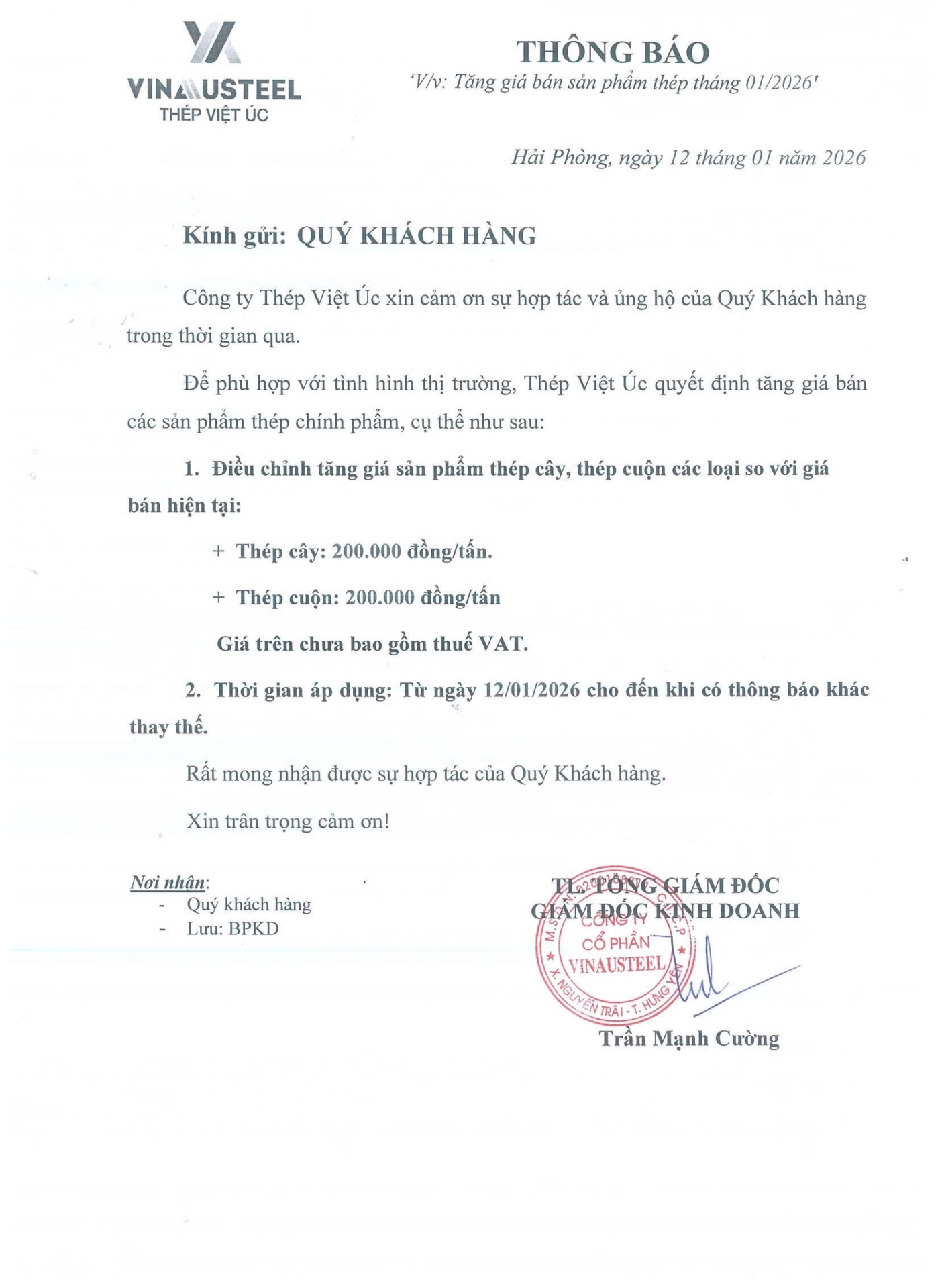 Trước đó, Thép Việt Úc đã điều chỉnh giá thép cây xây dựng từ ngày 26/12/2025 với mức tăng 150 đồng/kg và đến ngày 12/01/2026 tăng 200 đồng/kg giá thép cây và thép cuộn các loại so với giá bán hiện tại, giá chưa bao gồm VAT.