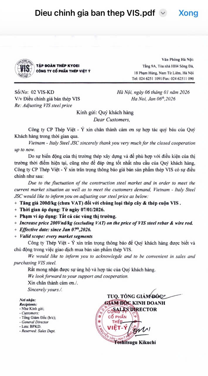 Thép Việt Ý áp dụng mức tăng 200 đồng/kg đối với thép cây và thép cuộn VIS từ ngày 07/01/2026 trên phạm vi toàn thị trường, phản ánh việc điều chỉnh đồng loạt cho các dòng sản phẩm chủ lực.