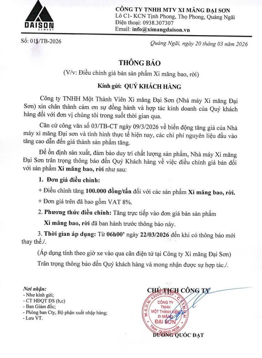 Xi măng Đại Sơn điều chỉnh tăng 100.000 đồng/tấn (đã gồm VAT) đối với cả xi măng bao và xi măng rời, áp dụng từ 06h ngày 22/03/2026.