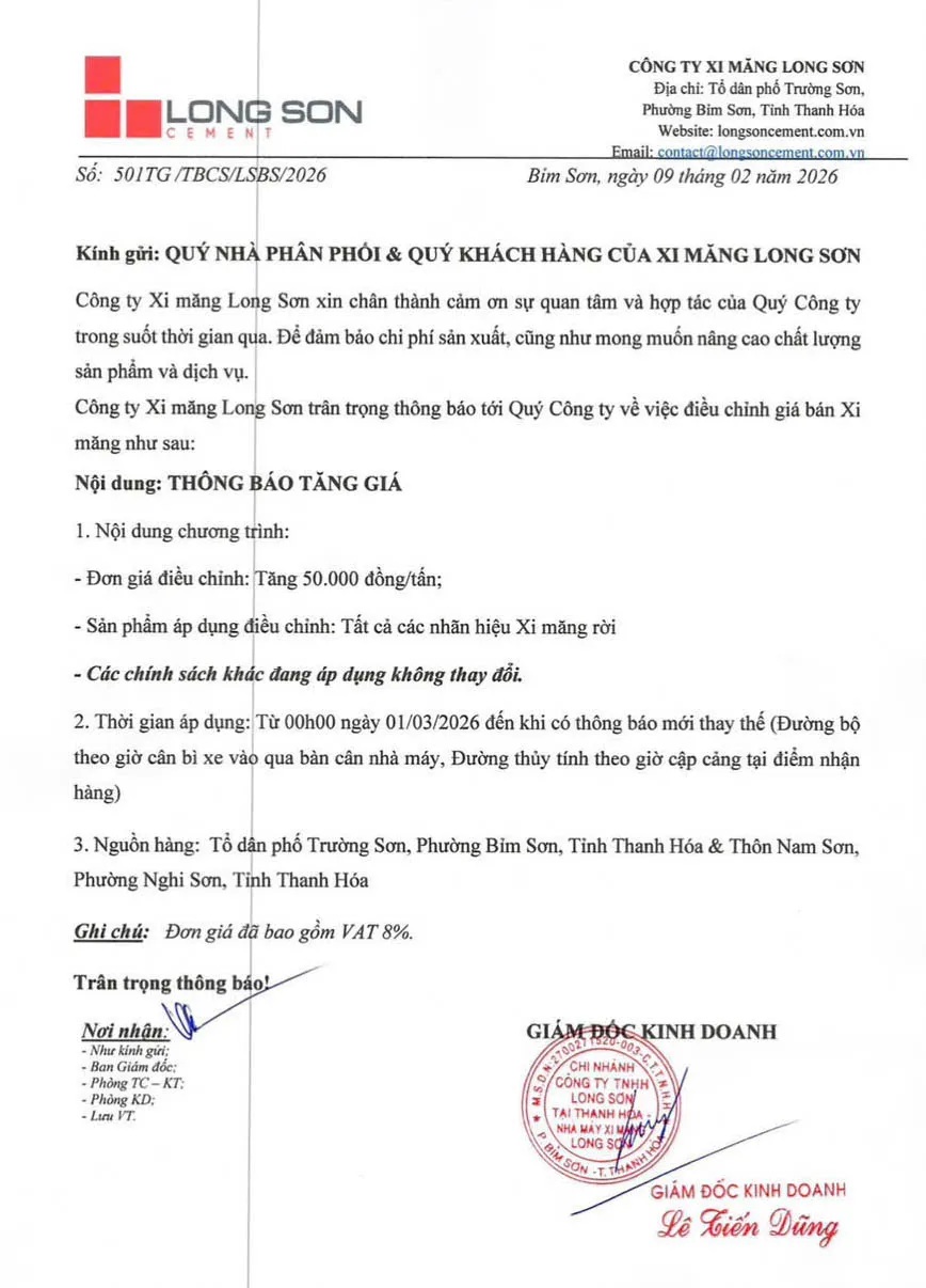 Đối với Công ty Xi măng Long Sơn, doanh nghiệp điều chỉnh tăng 50.000 đồng/tấn (đã bao gồm VAT) đối với toàn bộ các nhãn hiệu xi măng rời trong hệ thống phân phối, áp dụng từ 01/03/2026.