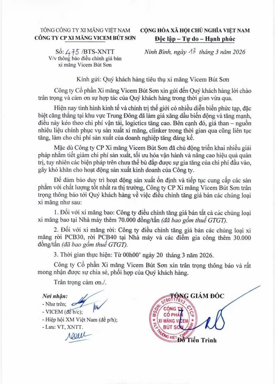 » Trước áp lực chi phí đầu vào tiếp tục gia tăng, Xi măng Vicem Bút Sơn thông báo điều chỉnh tăng giá bán đối với cả xi măng bao và xi măng rời, áp dụng từ ngày 20/03/2026.