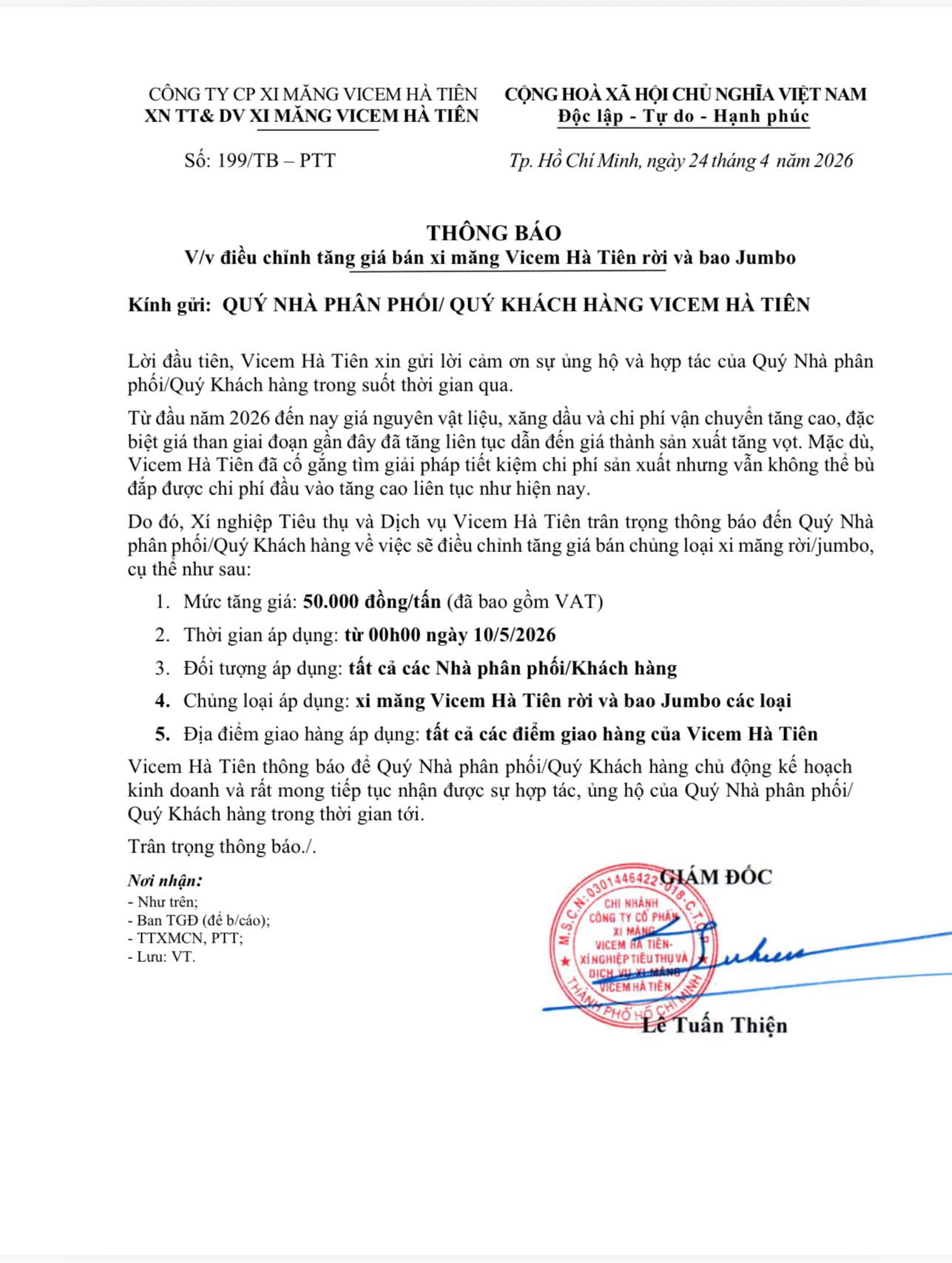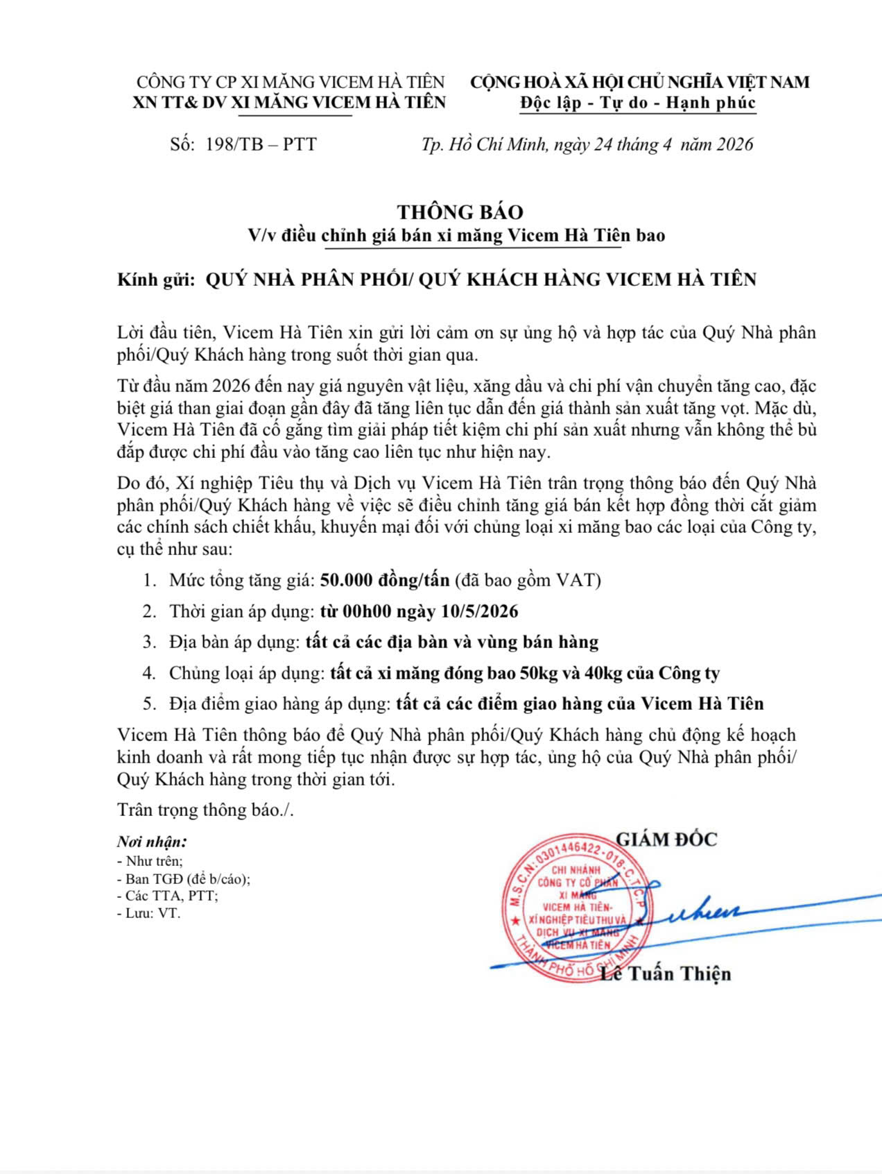 Thời gian áp dụng bắt đầu từ 00h00 ngày 10/5/2026 trên toàn bộ hệ thống phân phối và các điểm giao hàng của Vicem Hà Tiên.