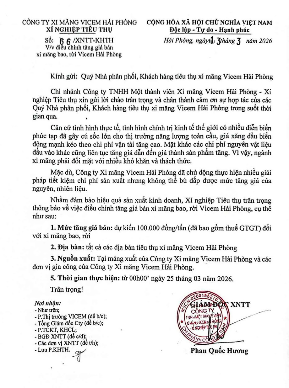 Cụ thể, mức điều chỉnh dự kiến tăng 100.000 đồng/tấn (đã bao gồm VAT) đối với cả xi măng bao và xi măng rời. Mức giá mới được áp dụng trên toàn bộ các địa bàn tiêu thụ sản phẩm của VICEM Hải Phòng, bao gồm cả sản phẩm sản xuất trực tiếp tại nhà máy và các đơn vị gia công. Thời điểm áp dụng chính thức từ 00h00 ngày 25/03/2026.