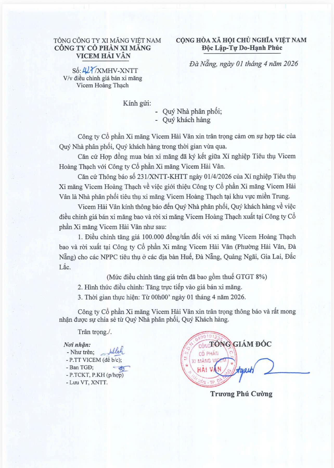 Trên cơ sở đó, Công ty Cổ phần Xi măng Vicem Hải Vân - đơn vị phân phối tại khu vực miền Trung, đã triển khai áp dụng mức giá mới đối với xi măng Vicem Hoàng Thạch. Cụ thể, mức điều chỉnh tăng 100.000 đồng/tấn đối với cả xi măng bao và xi măng rời xuất tại Vicem Hải Vân, áp dụng cho các địa bàn gồm Huế, Đà Nẵng, Quảng Ngãi, Gia Lai và Đắk Lắk. Mức giá này đã bao gồm thuế GTGT và được tính trực tiếp vào giá bán sản phẩm.