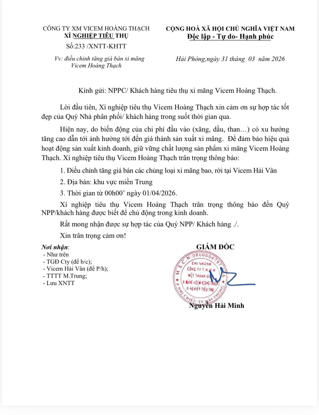 Theo thông báo từ Xí nghiệp tiêu thụ xi măng Vicem Hoàng Thạch, doanh nghiệp thực hiện điều chỉnh giá bán các chủng loại xi măng bao và xi măng rời nhằm đảm bảo hiệu quả sản xuất kinh doanh trong bối cảnh chi phí đầu vào như xăng, dầu, than… có xu hướng gia tăng. Việc điều chỉnh được áp dụng tại khu vực miền Trung, với thời gian thực hiện từ ngày 01/04/2026.