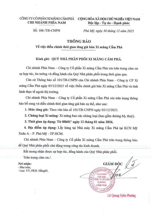 Theo thông tin mới nhất, thời điểm thực hiện tăng giá bán xi măng Cẩm Phả được điều chỉnh sang 00h01p ngày 12/01/2026. Việc thay đổi mốc thời gian nhằm thống nhất quá trình triển khai giá bán trong hệ thống phân phối tại khu vực phía Nam.
