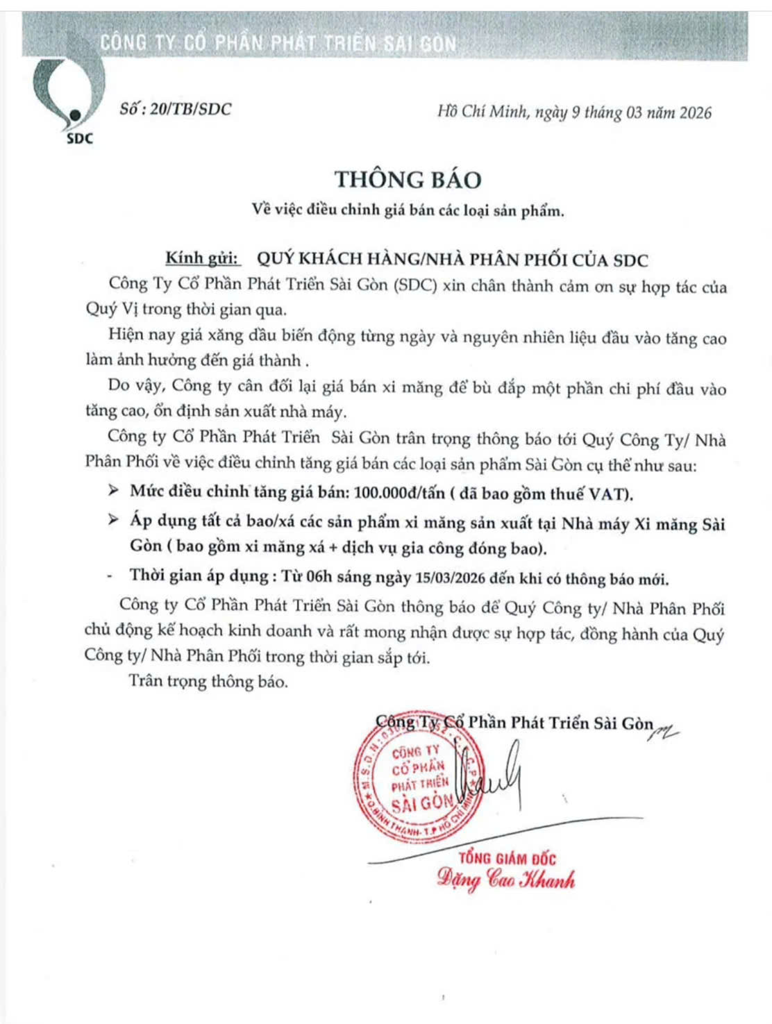 ♦ Chi tiết Thông báo điều chỉnh giá của Xi măng Sài Gòn