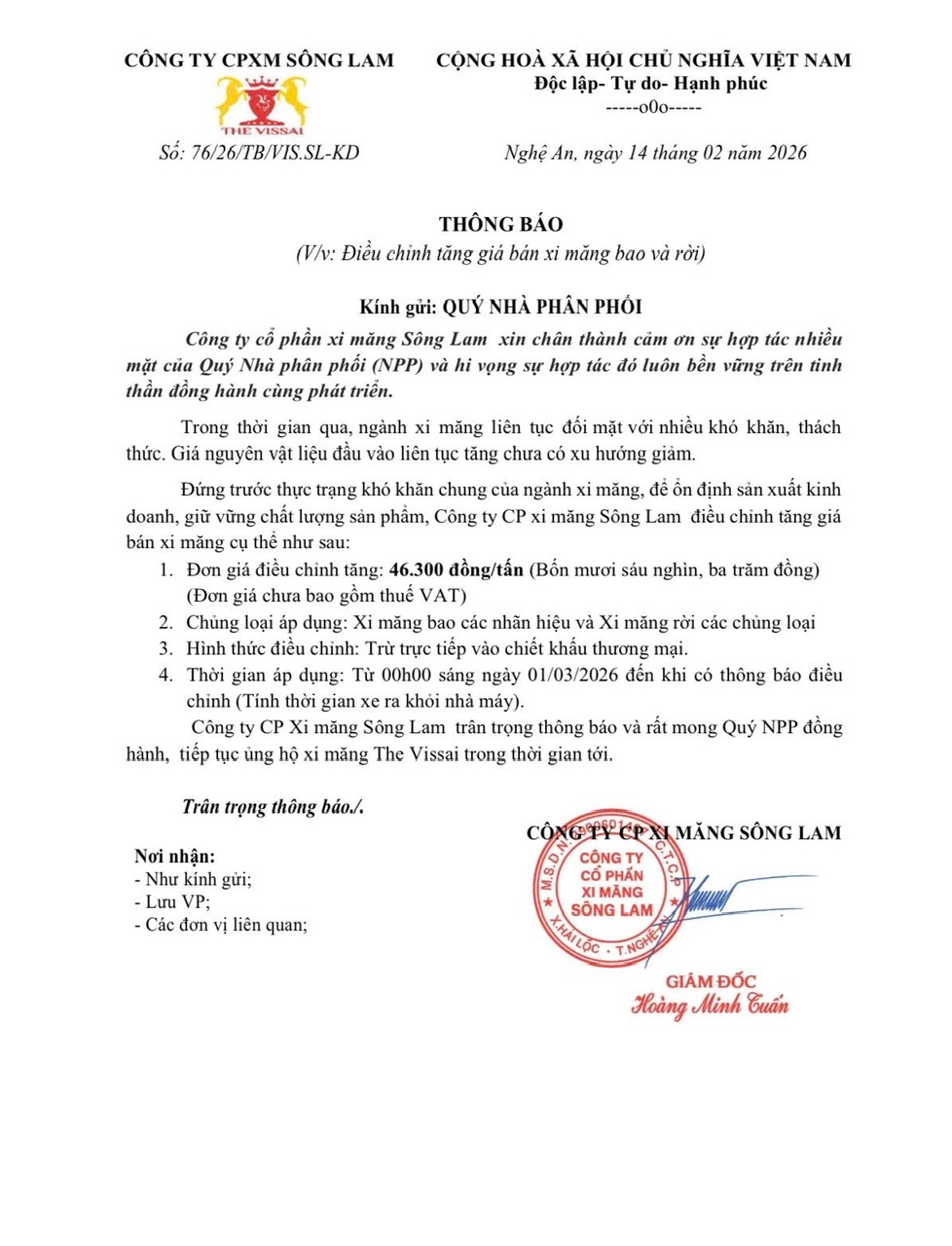 ♦ Chi tiết Thông báo điều chỉnh giá bán của Xi măng Sông Lam